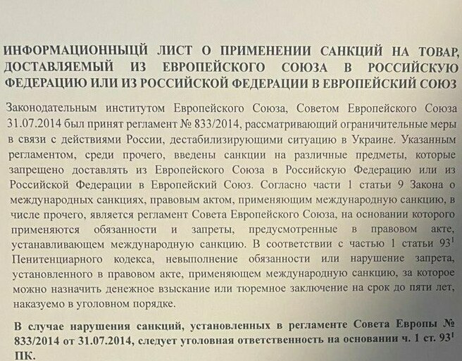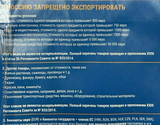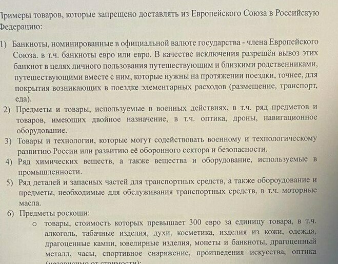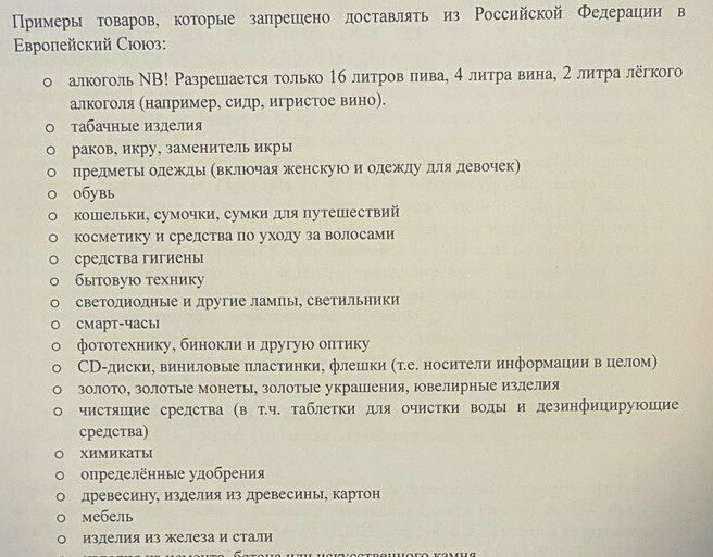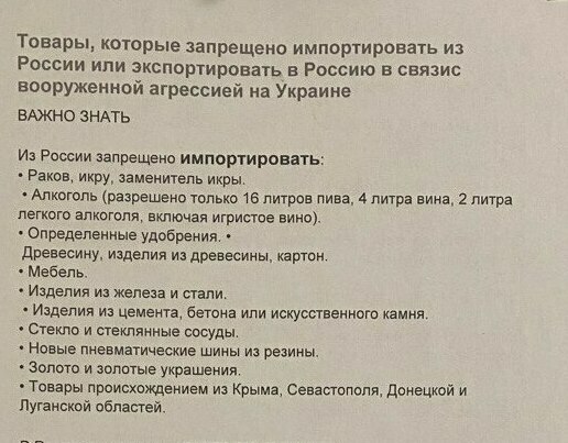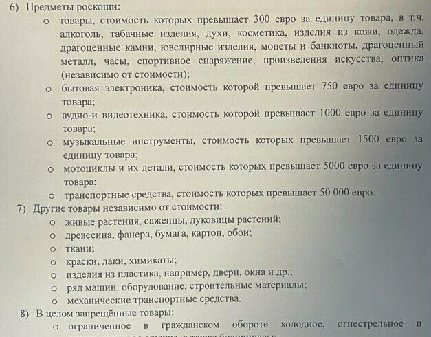 | Новые товары | В связи с введенными санкциями с обеих сторон, считается что ввозить запрещено абсолютно все, но уверяем Вас, что привезти можно практически все. | Индивидуально |